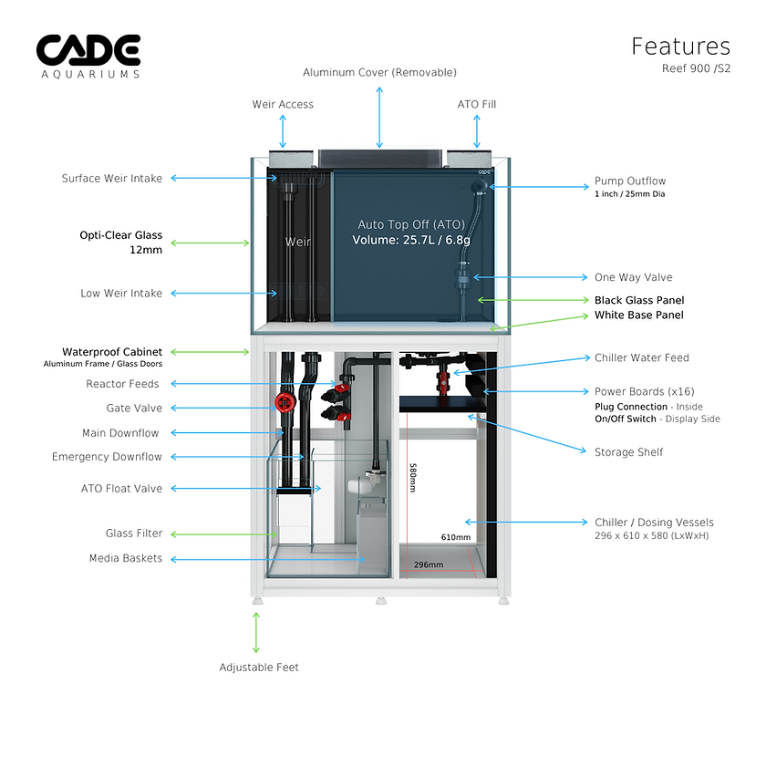The CADE Reef S2 900 is a medium-sized reef tank designed to offer both functionality and aesthetic appeal. Measuring 90cm (L) x 70cm (W) x 60cm (H), it has a total capacity of 373 liters. The tank is constructed with Opti-Clear glass for excellent visibility and durability. The advanced sump filtration system includes a silent ‘Twin Intake’ slimline weir, macro algae chamber, and customizable filter baskets. The cabinet is built from waterproof materials, featuring a chiller space, dosing shelf, and multiple power outlets for convenience. Adjustable leveling feet make it easy to set up.
