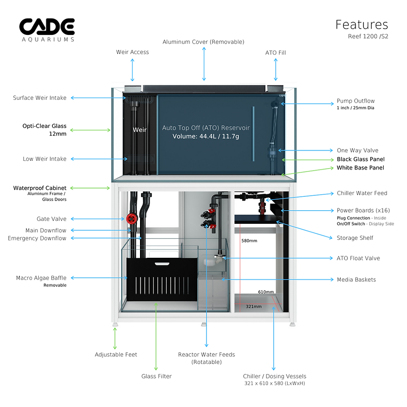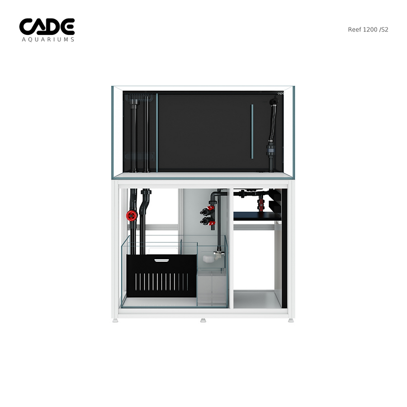 The CADE Reef S2 1200 is a premium rimless aquarium system tailored for advanced reef enthusiasts. With dimensions of 120cm (L) x 70cm (W) x 60cm (H), it boasts a system capacity of 512 liters and an inhabitable volume of 432 liters. Constructed with 12mm Opti-Clear glass, the tank ensures optimal visibility. The integrated sump filtration system features dual intake weirs, a macro algae chamber, and multiple filter baskets for efficient water management. The cabinet, measuring 120cm (L) x 70cm (W) x 90cm (H), is waterproof and includes a dedicated chiller space, dosing shelf, and 16 power outlets. Adjustable leveling feet and pre-assembled components facilitate straightforward setup.