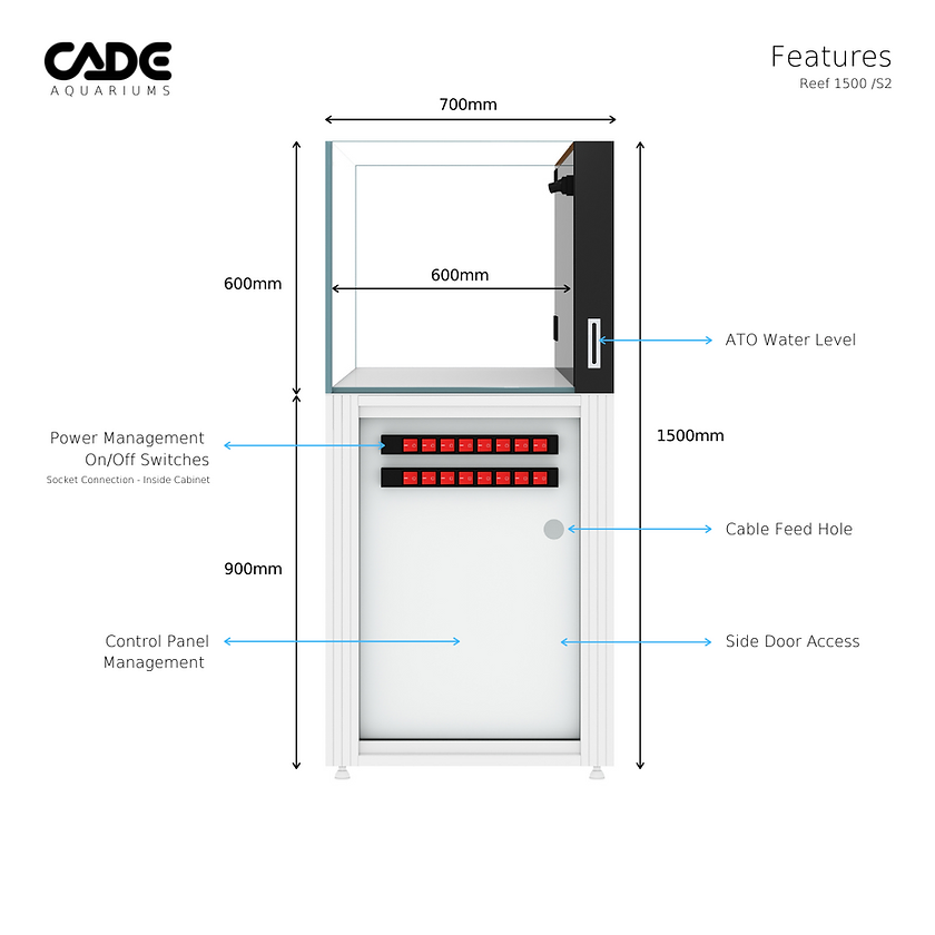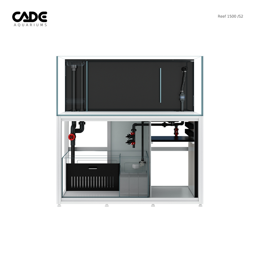 The CADE Reef S2 1500 is designed for aquarists seeking a spacious and customizable marine environment. Measuring 150cm (L) x 70cm (W) x 60cm (H), it offers a system capacity of 640 liters and an inhabitable volume of 540 liters. The aquarium is built with 15mm Opti-Clear glass and features a rimless, open-top design. The sump system includes dual intake weirs, a removable macro algae chamber, and multiple filter baskets. The accompanying cabinet, sized at 150cm (L) x 70cm (W) x 90cm (H), is waterproof and equipped with a chiller space, dosing shelf, and 16 power outlets. Pre-assembled with adjustable leveling feet, the setup process is simplified.