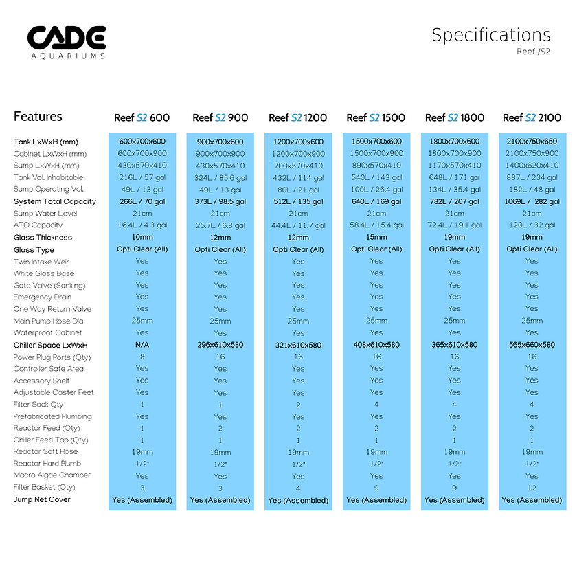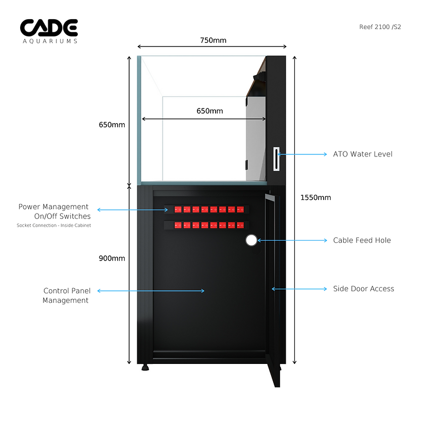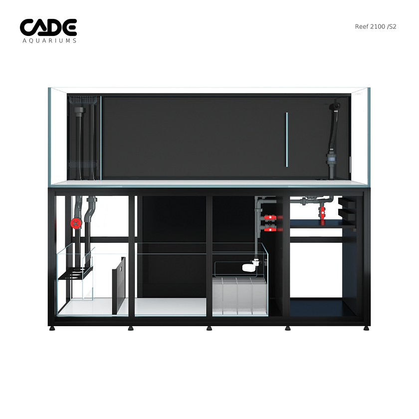 The CADE Reef S2 2100 is the pinnacle of the Reef S2 series, offering an extensive marine habitat for serious aquarists. Measuring 210cm (L) x 75cm (W) x 65cm (H), it boasts a system capacity of 1069 liters. The aquarium is crafted from high-quality Opti-Clear glass and features a rimless, open-top design. The advanced sump filtration system includes dual intake weirs, a removable macro algae chamber, and multiple filter baskets. The accompanying cabinet is waterproof and equipped with a chiller space, dosing shelf, and multiple power outlets. Pre-assembled with adjustable leveling feet, it ensures a seamless setup experience.