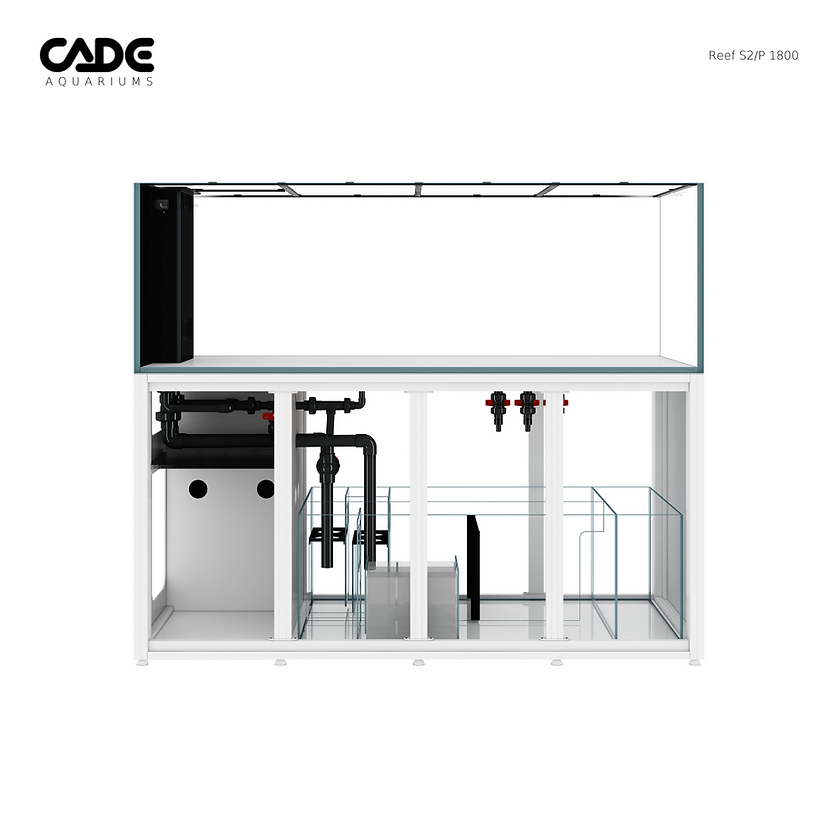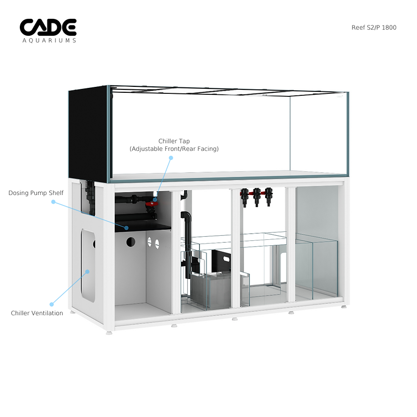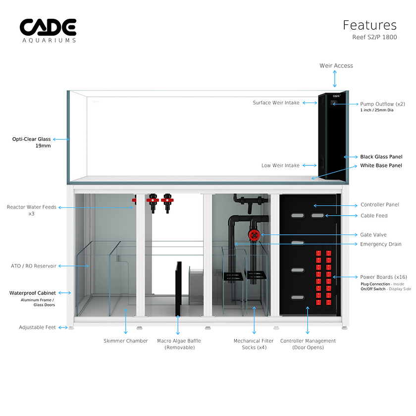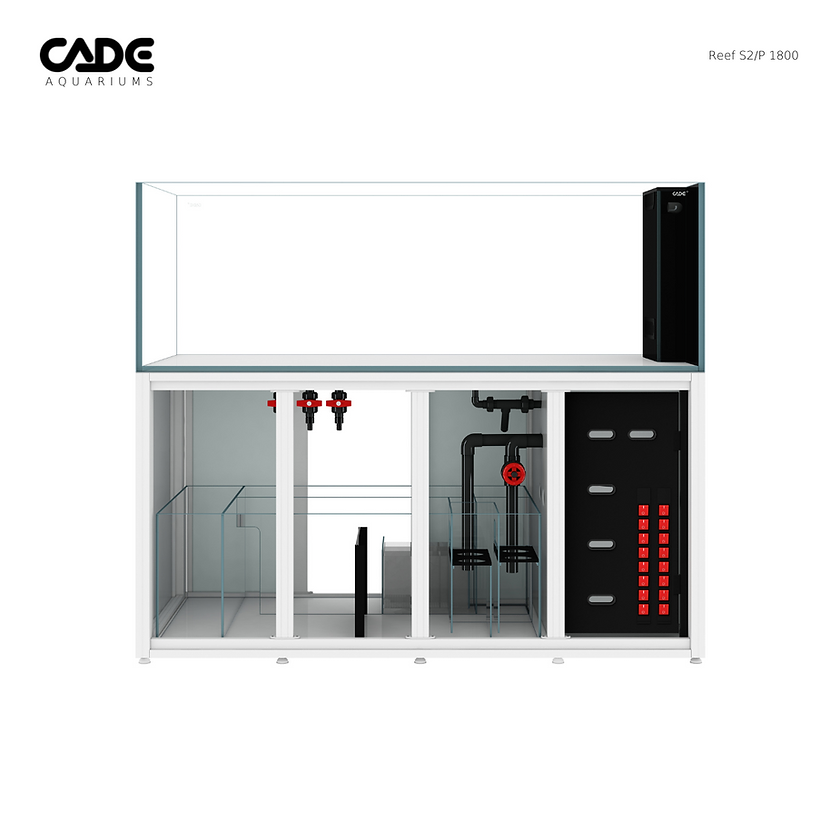 The CADE Reef S2/P Peninsula 1800 is the ultimate peninsula-style aquarium, offering expansive space and unparalleled design. With dimensions of 180cm (L) x 80cm (W) x 60cm (H), it features a total system capacity of 1005 liters. The tank is constructed with super high clarity Opti-Clear glass, providing an unobstructed view of your aquatic environment. The integrated sump filtration system includes dual intake weirs, a macro algae chamber, and customizable filter baskets. The waterproof cabinet is designed with a chiller compartment, dosing shelf, and multiple power outlets, ensuring a professional-grade setup. Adjustable leveling feet allow for effortless installation.