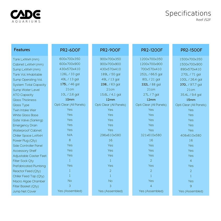 The CADE Reef S2/F Frag 600 is a compact fragging tank tailored for smaller-scale coral propagation projects. With dimensions of 60cm (L) x 70cm (W) x 35cm (H), it has a total capacity of 175 liters. Constructed with Opti-Clear glass, the tank provides excellent clarity and durability. The sump filtration system includes a silent ‘Twin Intake’ weir and multiple filter baskets for effective water quality management. The cabinet is waterproof and designed for efficient functionality, featuring a chiller compartment and dosing shelf.