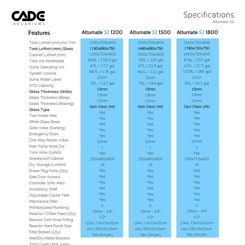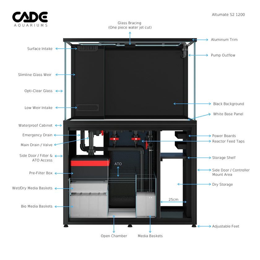 The CADE Altumate S2 1200 is a premium aquarium system designed for both freshwater and saltwater applications. Measuring 120cm (L) x 70cm (W) x 80cm (H), it offers a display capacity of 667 liters. The tank features Opti-Clear glass with flat polished edges and a slimline aluminum trim for enhanced support and protection. An internal corner weir delivers water silently to a state-of-the-art sump filter, which includes an elevated pre-filter chamber with filter socks and a filter pad tray. The cabinet is constructed with an aluminum frame and glass panels, available in black or white, and comes pre-assembled.
