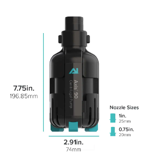 The AI Axis 90 Centrifugal Pump is ideal for aquariums up to 90 gallons, offering a flow rate of approximately 925 gallons per hour (3,500 liters per hour) and a max head of about 10 feet (3 meters). It operates with minimal noise and consumes up to 40 watts of power. The pump features wireless smart device programming via the myAI or Mobius app, enabling Schedule, Feed, and Calibrate modes for tailored performance.